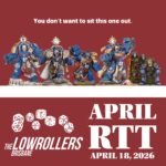 Lowrollers April RTT The incredible Lowrollers RTT is coming back again in APRIL! This is a 3-round singles event using the Chapter Approved 2025-26 Mission Deck. Who will come out on top? Who will get the coveted Lowest Roller Award? HOW MANY CALGARS WILL BE IN ATTENDANCE??? The Important Information When April 18, 20268:30 AM … Read more: Lowrollers April RTT - Game Night Thursday 5/2/2026 / LR Summer League R4 / What the shirt?